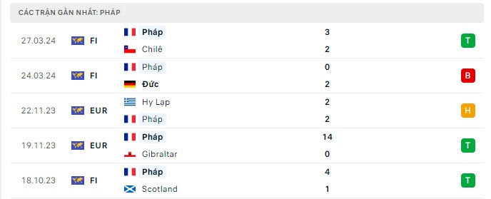 Sau thất bại trong trận chung kết World Cup trước Argentina, Pháp đang duy trì mạch trận đấu khá ấn tượng tại vòng loại EURO 2024. Họ tích lũy được 22 trong tổng số 24 điểm tối đa, trong đó có chiến thắng đậm nhất lịch sử 14-0 trước Gibraltar.