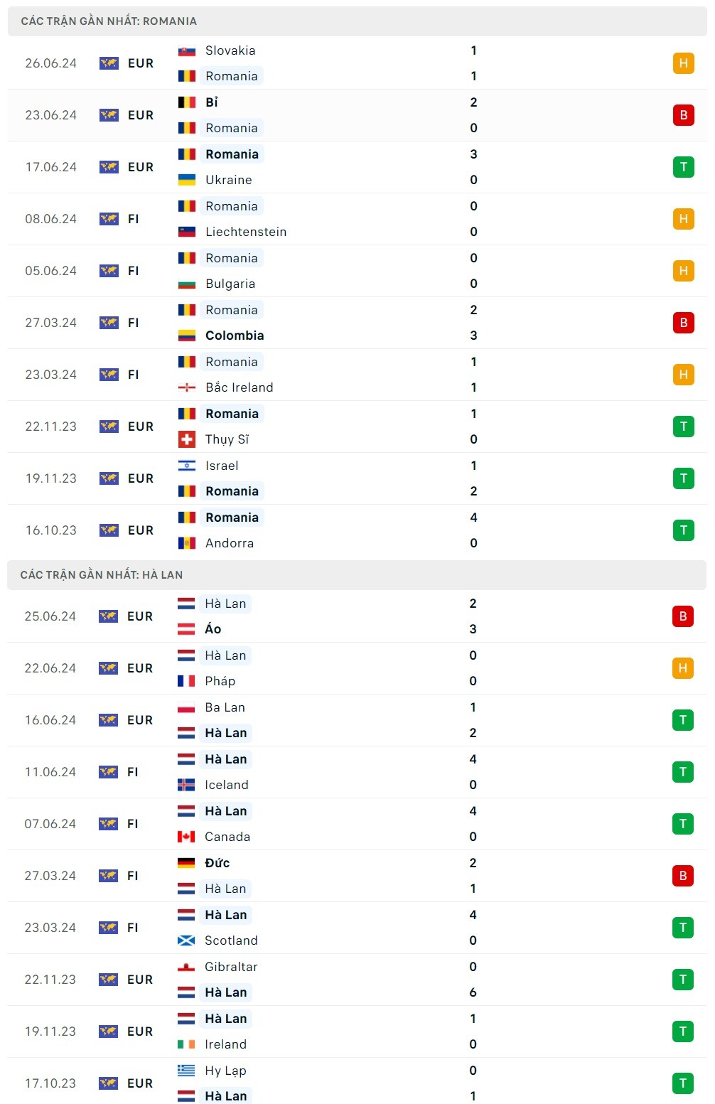 10 trận gần đây Romania ghi 1.4 bàn/trận – Hà Lan ghi 2.5 bàn/trận
