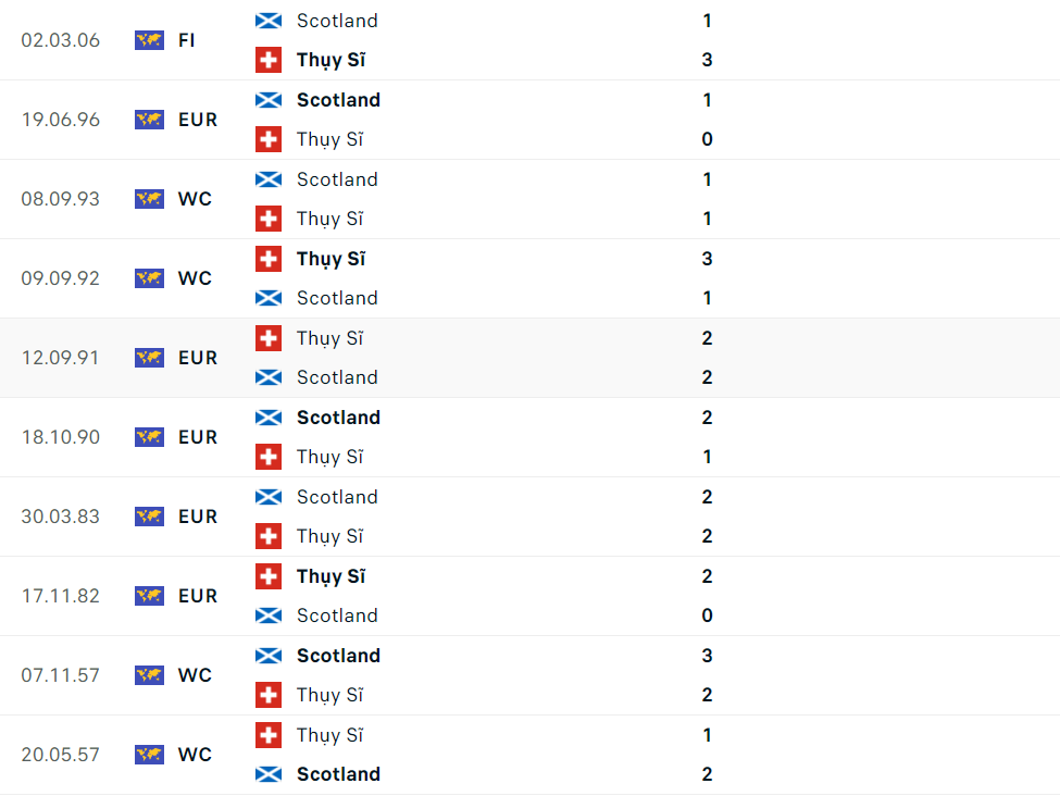 Dẫu vậy đây cũng là chiến thắng duy nhất của Scotland trong 5 trận gần nhất trước Thụy Sĩ trên mọi đấu trường (hòa 2, thua 2). Trong trận giao hữu gần nhất diễn ra vào năm 2006, đội tuyển Thụy Sỹ đã đánh bại Scotland với tỷ số 3-1. Và với sự nhỉnh hơn về lực lượng, sẽ không bất ngờ nếu đại diện bóng đá xứ sở đồng hồ có thêm một thắng lợi trong cuộc đọ sức lần này.