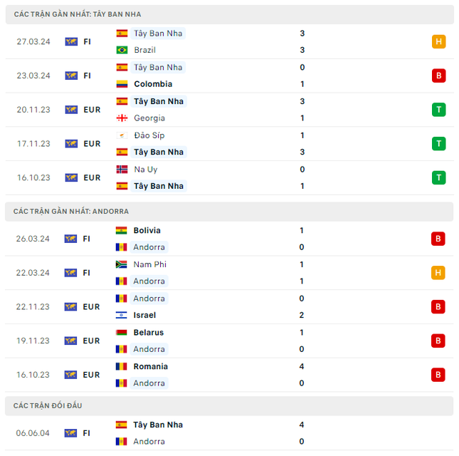 Thành tích gần đây, lịch sử đối đầu Tây Ban Nha vs Andorra