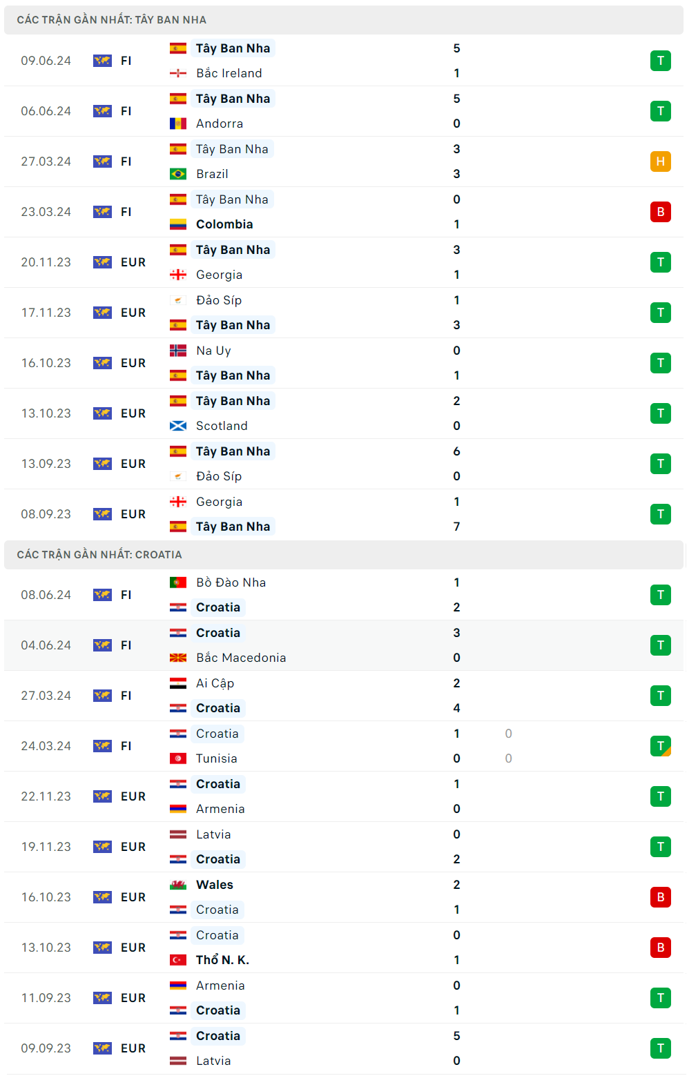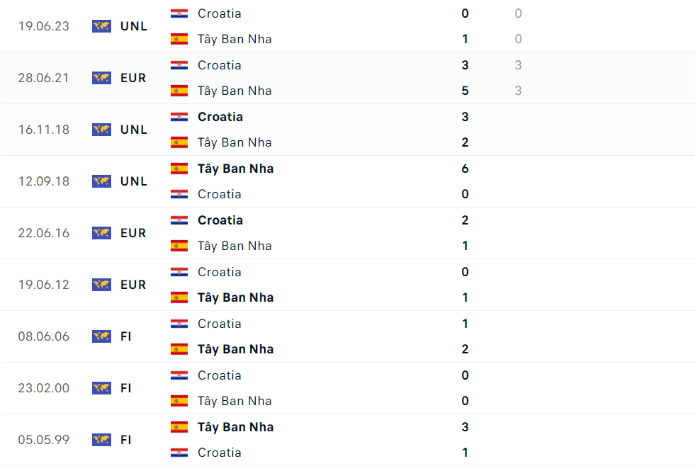 - Trong 6 trận đối đầu gần nhất, Tây Ban Nha giành 4 chiến thắng còn Croatia thắng 2 trận.