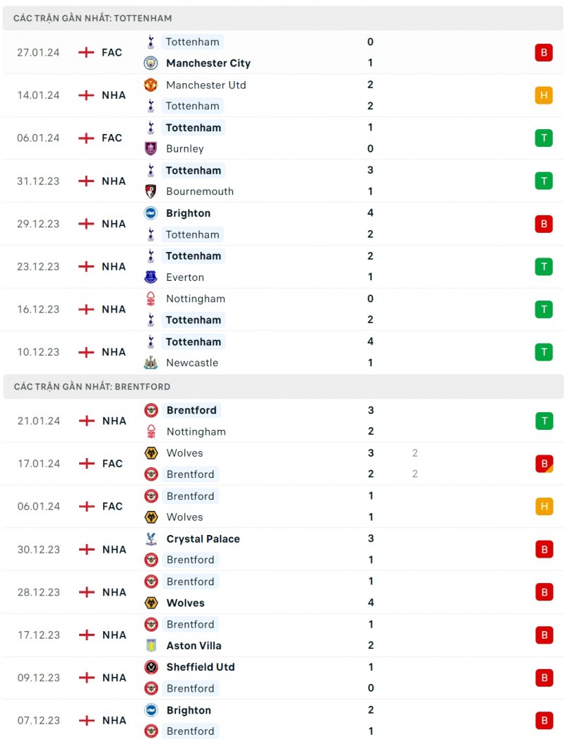 Ít ngày sau thất bại 0-1 trước đội khách Man City tại vòng 4 cúp FA, câu lạc bộ Tottenham sẽ tiếp tục có được lợi thế về sân nhà khi tiếp đón đội bóng Brentford trong khuôn khổ vòng 22 Ngoại hạng Anh 2023/2024.