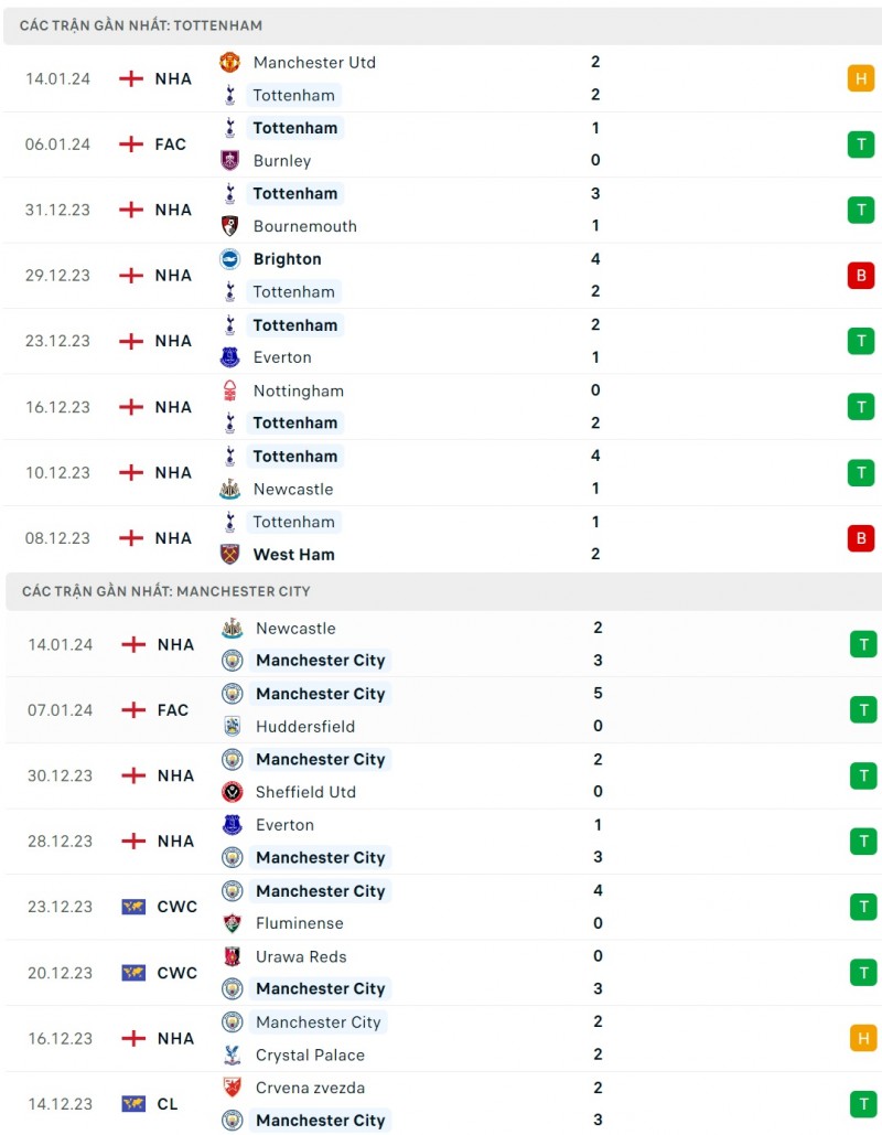 - Tottenham thắng 5, hòa 2, thua 3 trước Man City trong 10 cuộc đối đầu gần nhất.