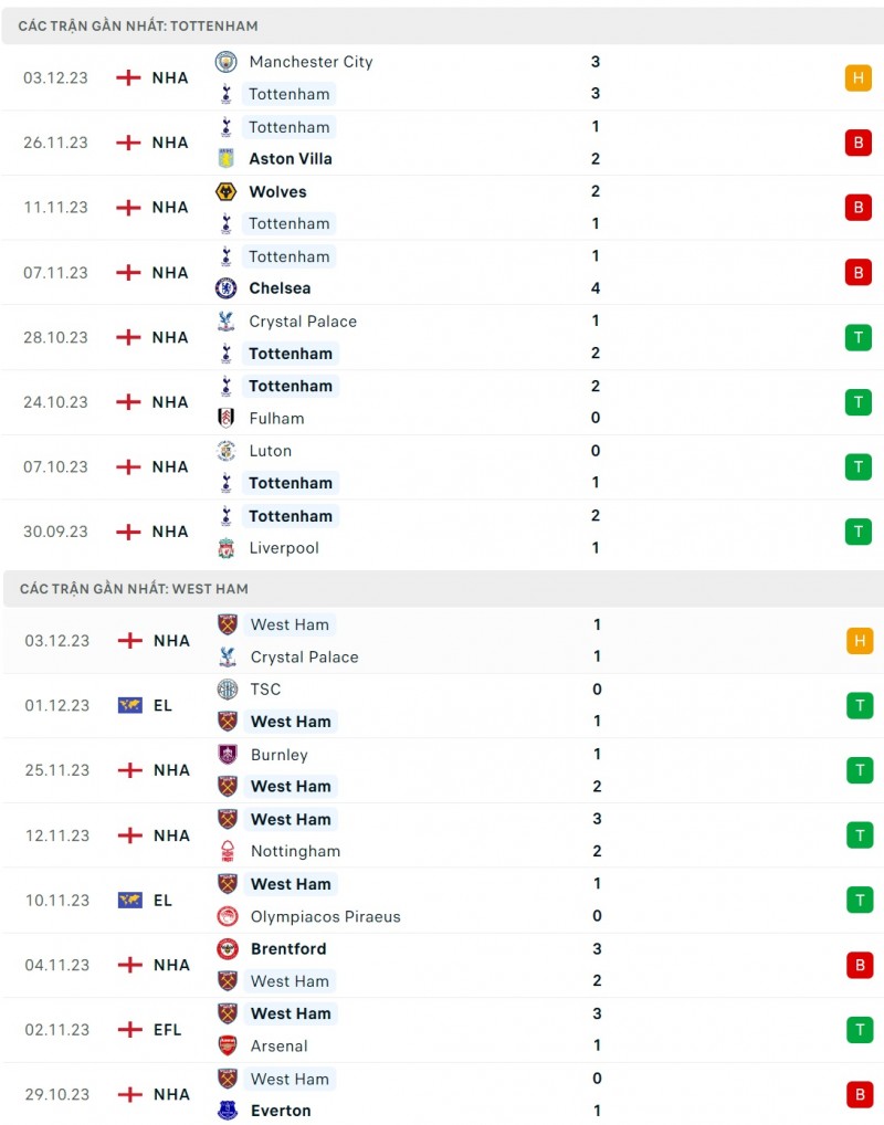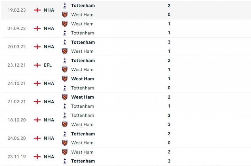 Không tính thất bại trước West Ham ở trận giao hữu mùa hè 2023 thì trong 10 trận đấu chính thức gần nhất, các cầu thủ Tottenham đang có được kết quả đối đầu tốt hơn đối thủ. Theo đó, "Spurs" đã thắng 5, hòa 2 và mới để thua 3 trước "The Hammers".
