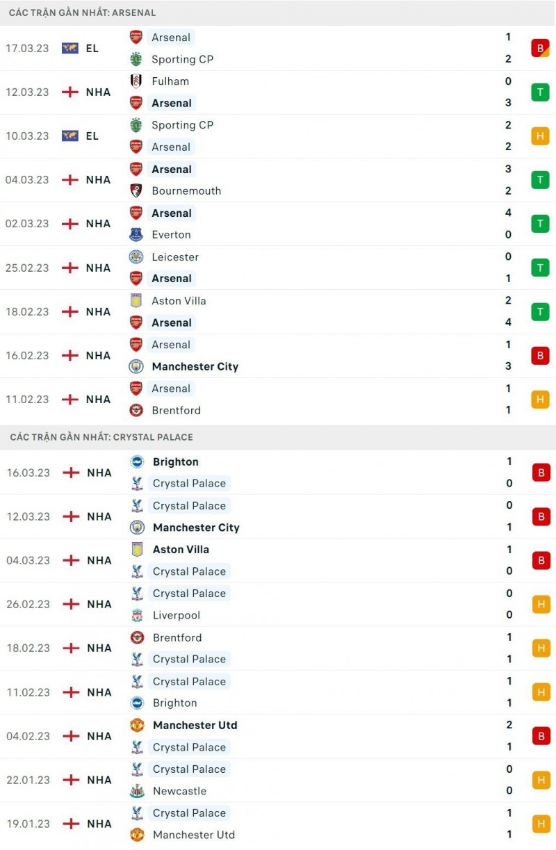 - Arsenal không quá vượt trội Crystal Palace ở những lần đối đầu khi chỉ thắng 2/5 lần gặp gần nhất. 2 trận còn lại kết thúc với tỷ số hòa và Crystal Palace thắng 1 trận.