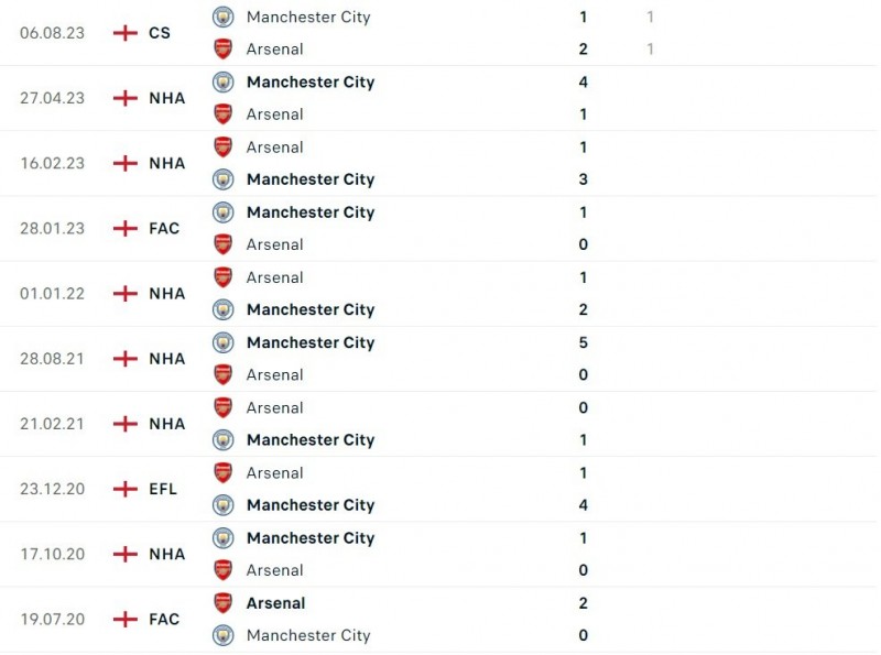 Thành tích gần đây của Arsenal và Man City