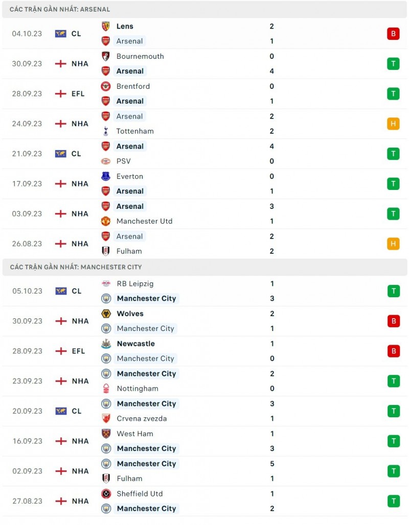 Trước trận đại chiến lần này, hai bên đều đã có những kết quả thi đấu khá trái ngược. Trong khi câu lạc bộ Arsenal gây thất vọng với trận thua ngược 1-2 trước đối thủ 'dưới cơ' Lens trên sân khách thì đoàn quân của huấn luyện viên (HLV) Pep Guardiola lại thể hiện được sức mạnh với trận thắng 3-1 trên sân của đội bóng Đức, RB Leipzig.