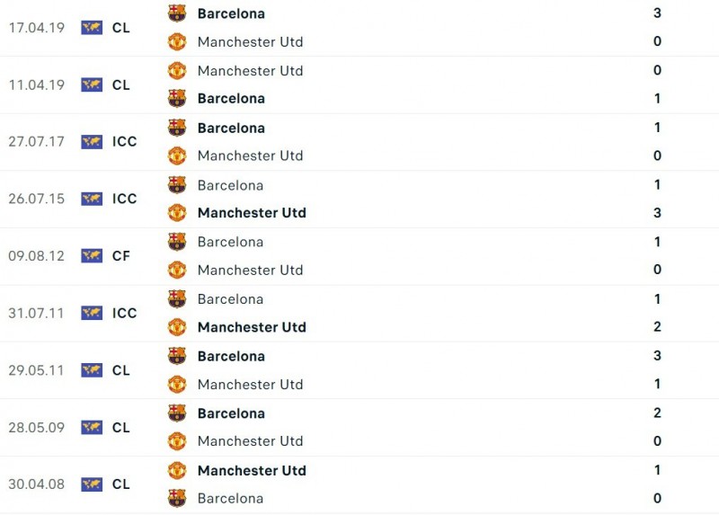 - Trong lịch sử, CLB Barcelona và MU đã gặp nhau 10 lần. Barca giành được 6 chiến thắng, hòa 1 và chỉ thua 3. Trong những trận đấu này, Barca ghi được 12 bàn và có 7 lần để lọt lưới.