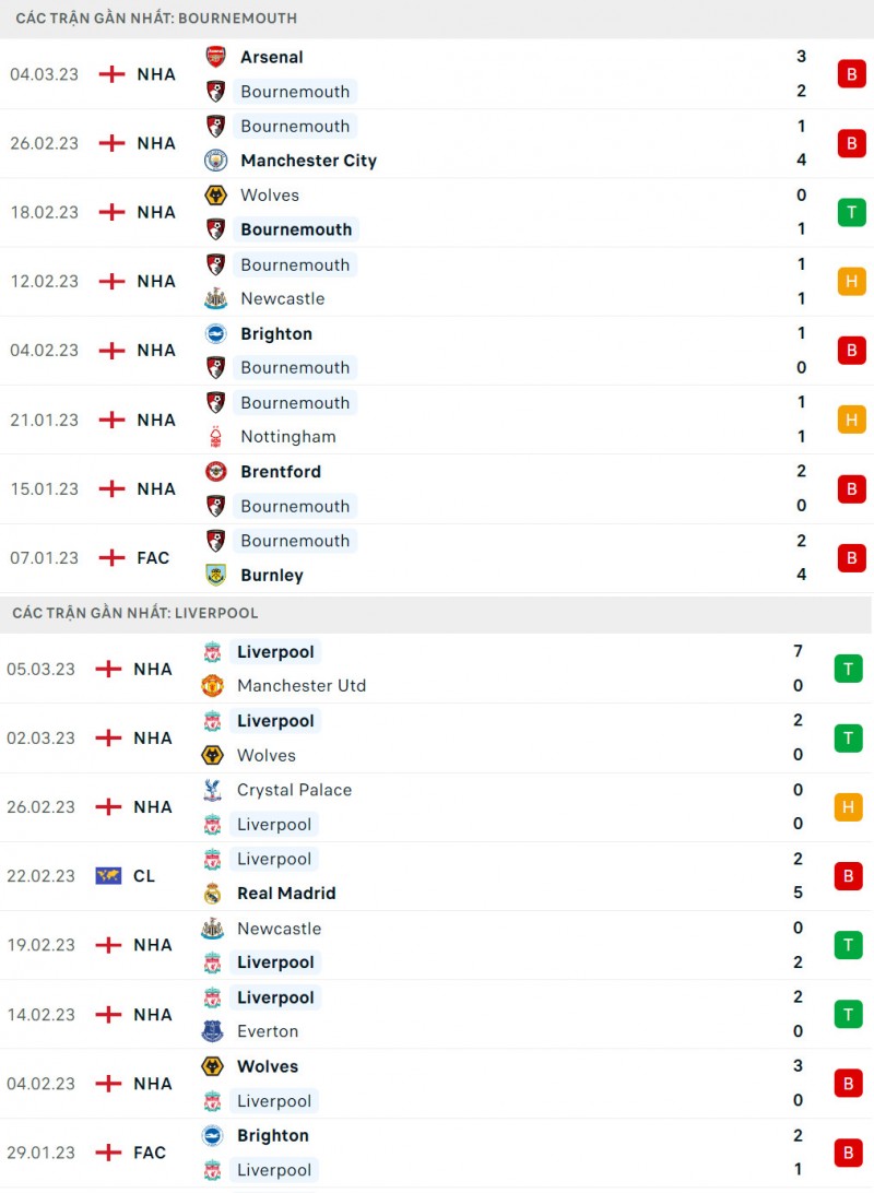 - Bournemouth đã để thua ở cả 7 trận đấu gần đây trước Liverpool.