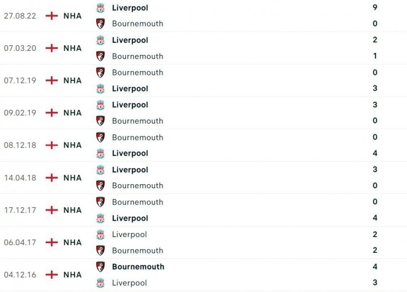- 10 trận đối đầu gần nhất giữa Bournemouth và Liverpool đều có ít nhất 3 bàn thắng được ghi trong mỗi trận.