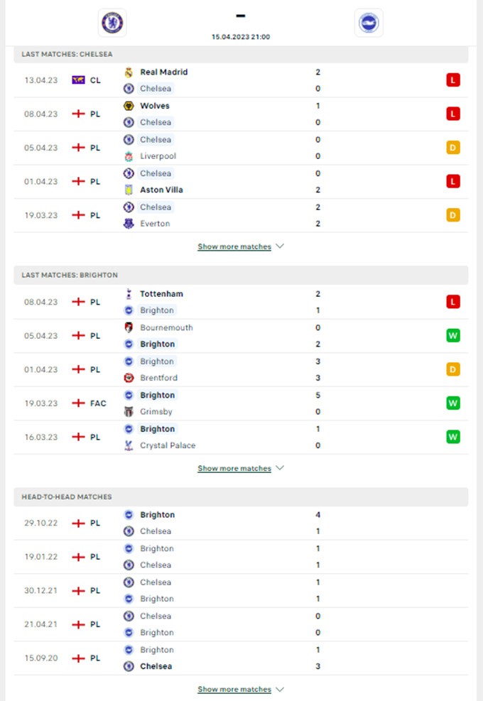 | Phong độ thi đấu & Lịch sử đối đầu của câu lạc bộ Chelsea và Brighton |