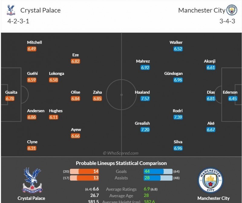 Mặc dù vậy, thầy trò Pep sẽ không được phép thi đấu chủ quan, coi thường đối thủ bởi Crystal Palace vẫn đang thi đấu khá tốt trên sân nhà. Họ bất bại ở 4 trận đấu sân nhà gần nhất, trong đó có các trận hòa trước cả MU và Liverpool. Và nếu không đá nghiêm túc, Man City chắc chắn sẽ gặp không ít khó khăn trước đội bóng thành London.