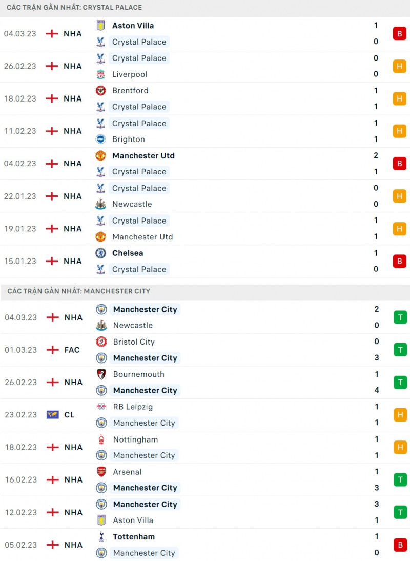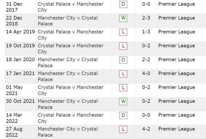 Ở 10 lần gặp nhau gần đây giữa hai đội, Man City đang cho thấy sự vượt trội với 5 chiến thắng, 2 trận hòa và chỉ để thua 2 trận. Tại trận đấu lượt đi mùa này, Crystal Palace từng suýt tạo nên bất ngờ trước Man City khi dẫn trước tới 2 bàn ngay tại Etihad. Dù vậy, họ đã không duy trì được lợi thế khi để 'The Citizens' vùng lên trong hiệp 2.