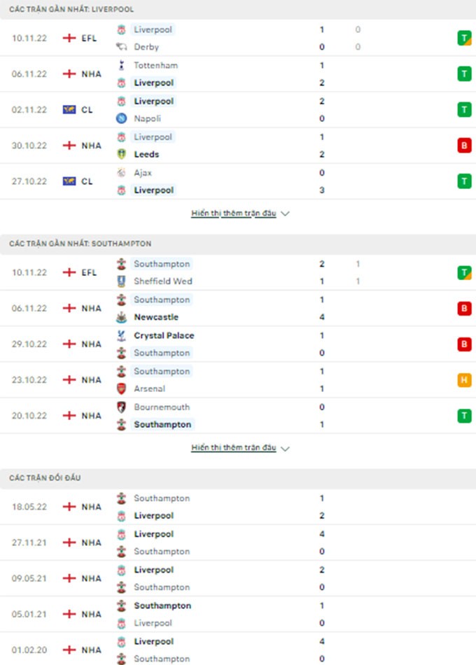 | Thành tích gần đây của Liverpool – Southampton |