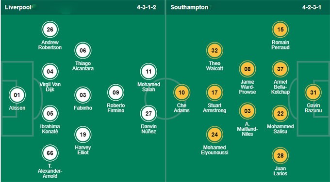 - Liverpool: Alisson, Alexander-Arnold, Konate, Van Dijk, Robertson, Salah, Fabinho, Thiago, Elliott, Nunez, Firmino.