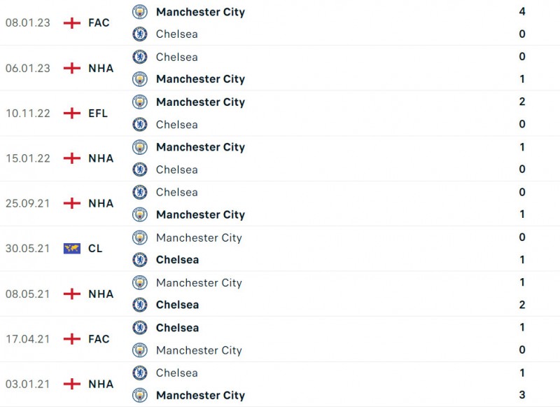 - Manchester City toàn thắng trước Chelsea trong 5 màn so tài gần đây.