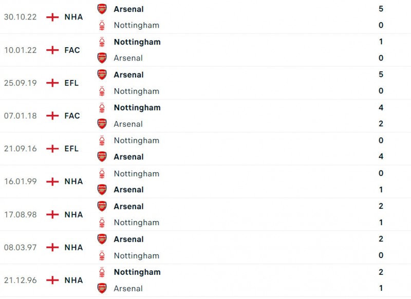 - 4/5 trận đối đầu vừa qua giữa Nottingham và Arsenal có ít nhất 4 bàn thắng được ghi mỗi trận.
