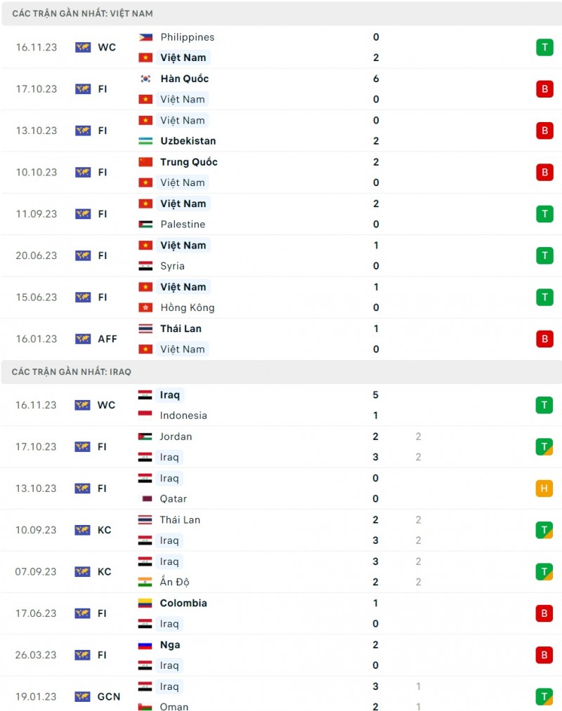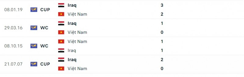 - Việt Nam thắng 5, hòa 1, thua 4 trong 10 trận gần nhất. Iraq thắng 7, hòa 1 và thua 2 ở 10 trận gần nhất.