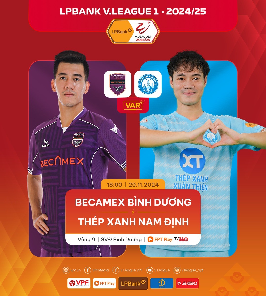 Trận đấu giữa Bình Dương và Nam Định thuộc Vòng 9 V-League 2024/2025 sẽ diễn ra vào lúc 18h ngày 20/11. Ảnh: V-League