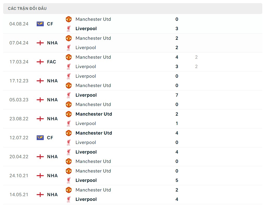 Trong lịch sử, MU là đội có thành tích đối đầu nhỉnh hơn với 91 chiến thắng so với 81 chiến thắng của Liverpool. Tuy vậy, trong những năm gần đây, kết quả chiến thắng thường nghiêng về phía The Kop. Tuy vậy, người hâm mộ MU vẫn có lý do để tự tin khi ở mùa giải năm ngoái, trong 3 lần đụng độ nhau giữa hai đội, MU đã bất bại trong cả 3 trận, trong đó có chiến thắng kịch tính 4-3 tại FA Cup.