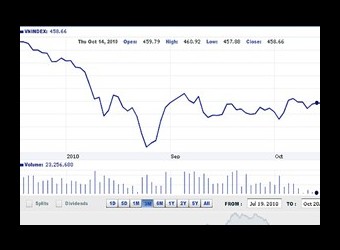 “VN-Index đã tiến về sát mức 440 điểm trong phiên giao dịch sáng 20/10 do những thông tin không tốt từ tình hình kinh tế tài chính thế giới và nội tại nền kinh tế Việt Nam vừa được công bố. Đó là việc Ngân hàng Trung ương Trung Quốc bất ngờ nâng lãi suất 0.25% lần đầu tiên trong 3 năm qua và chỉ số giá tiêu dùng (CPI) tháng 10 của Hà Nội tăng 1,22%, CPI của Tp.HCM tăng 0,45% so với tháng trước.
