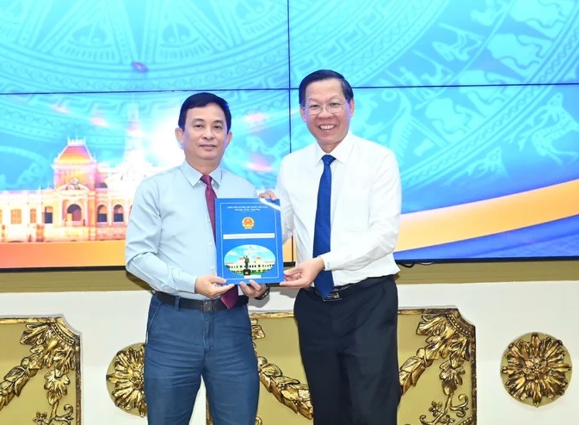 | Chủ tịch UBND TP. Hồ Chí Minh Phan Văn Mãi trao quyết định cho ông Nguyễn Kỳ Phùng. Ảnh: Việt Dũng |