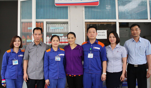 | Bà Phạm Thị Oanh (giữa) cùng lãnh đạo Petrolimex Lào Cai, cán bộ, nhân viên CHXD Kim Tân |
