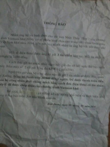 CôngThương - Ngay sau đêm công bố kết quả của Vietnam Idol diễn ra tối 11/5 với chiến thắng thuộc về cô gái Nam Định - Nhật Thủy, trên mạng bất ngờ xuất hiện văn bản được đánh bằng máy kêu gọi công nhân của một công ty dồn phiếu bình chọn cho cô.