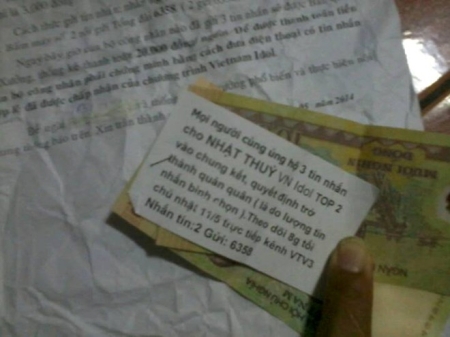 Ngay bây giờ cán bộ công nhân nào đã gửi 3 tin nhắn sẽ được ban quản lý xưởng thống kê thanh toán 20 ngàn đồng/người. Để được thanh toán tiền, cán bộ công nhân phải chứng minh bằng cách đưa điện thoại có tin nhắn hợp lệ đã được chấp nhập của chương trình Vietnam Idol”.