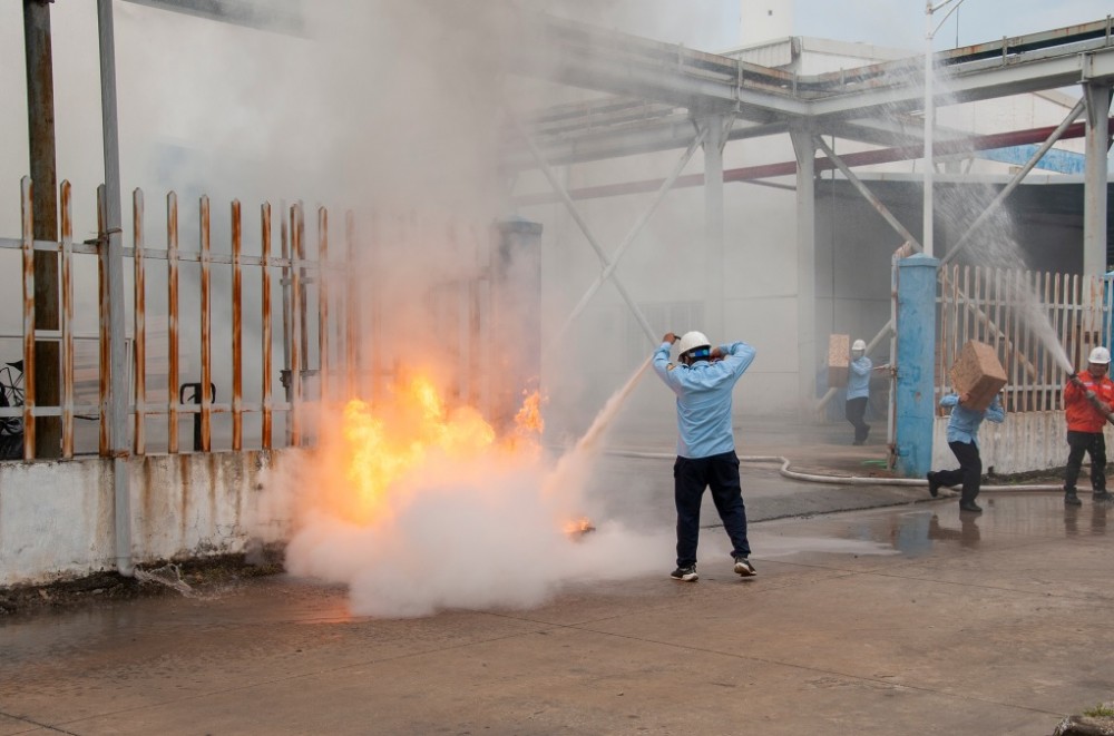 | Công nhân Nhiệt điện Hải Phòng thực tập phòng cháy chữa cháy |