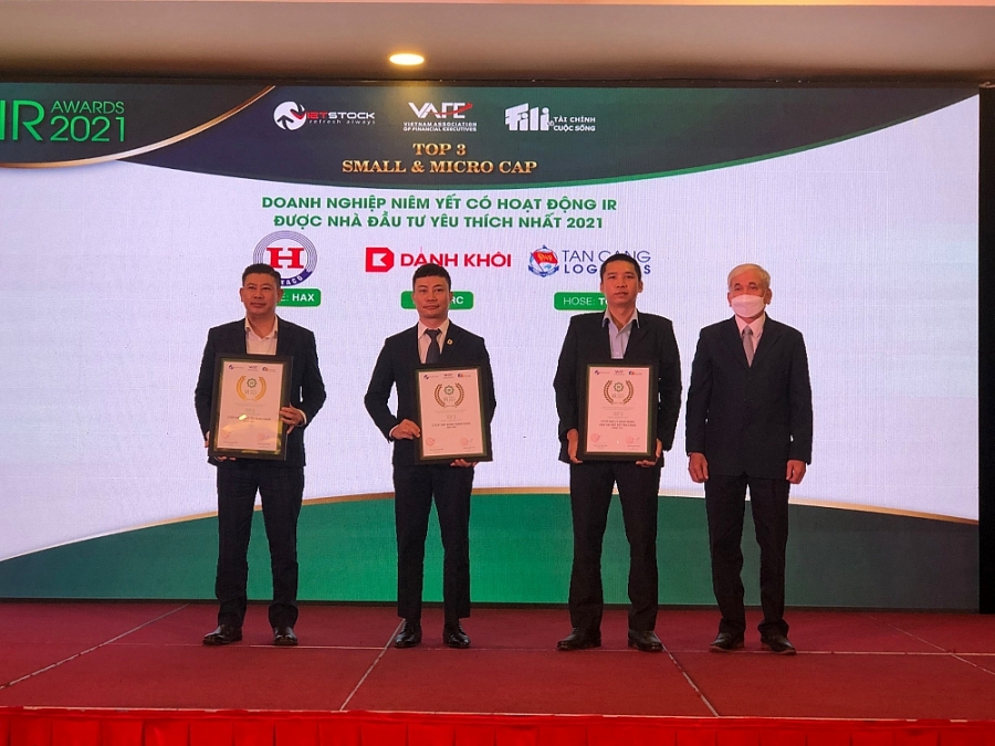 Top 3 Small & Micro Cap có hoạt động IR được nhà đầu tư yêu thích nhất 2021: CTCP Dịch vụ ô tô Hàng Xanh (HAXACO, HOSE: HAX); CTCP Tập đoàn Danh Khôi (HNX: NRC); CTCP Đại lý giao nhận vận tải xếp dỡ Tân Cảng (HOSE: TCL).