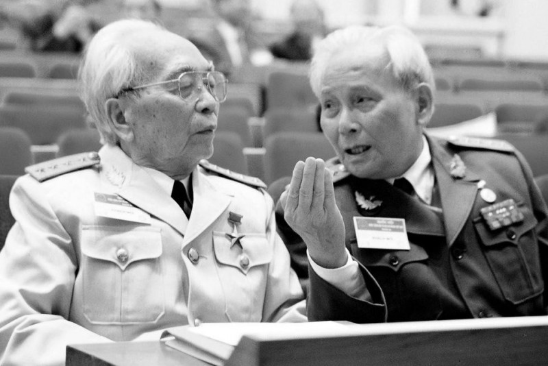 Đại tướng Võ Nguyên Giáp và Đại tướng Chu Huy Mân tại Hội trường Ba Đình ngày 12/11/2002. Ảnh tư liệu |