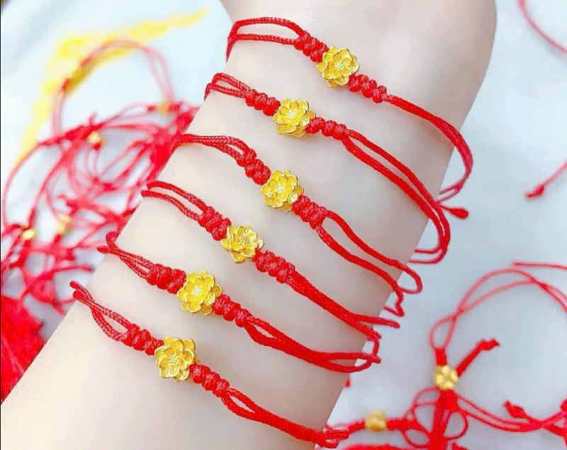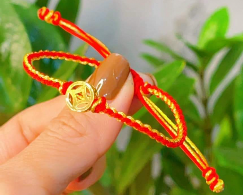 Trong số các sản phẩm, vòng tay chỉ đỏ kim tiền được nhiều người tiêu dùng quan tâm với thiết kế đơn giản, tinh tế, kết hợp giữa sắc vàng và sắc đỏ. Theo các chuyên gia phong thủy, vòng tay chỉ đỏ kim tiền thu hút tài lộc, sự giàu có.