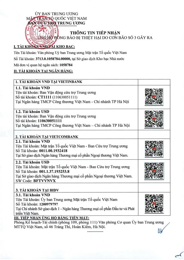 Ban Vận động Cứu trợ Trung ương trân trọng đề nghị các cơ quan, doanh nghiệp, tổ chức, cá nhân ở trong và ngoài nước khi ủng hộ đồng bào bị thiệt hại do cơn bão số 3 gây ra cần trực tiếp liên hệ với Cơ quan Ủy ban Trung ương Mặt trận Tổ quốc Việt Nam hoặc Ủy ban Mặt trận Tổ quốc Việt Nam 63 tỉnh/thành phố trực thuộc Trung ương trên cả nước để tìm hiểu thông tin, số tài khoản chuyển khoản.