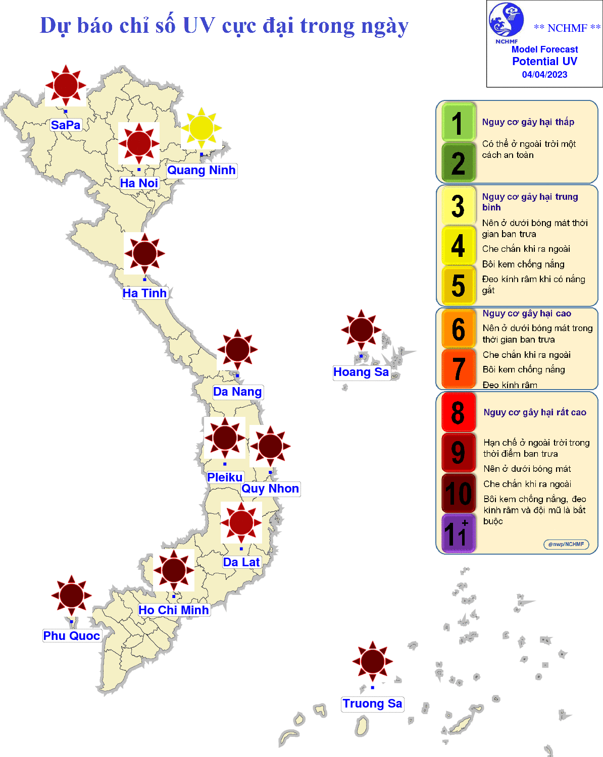 Theo Trung tâm dự báo khí tượng thủy văn quốc gia, riêng trong ngày 4/4, chỉ số tia cực tím tại nhiều tình, thành phố sẽ duy trì ở ngưỡng “nguy cơ gây hại rất cao” đối với sức khỏe con người, nhất là vào khoảng thời gian từ 10-13 giờ.