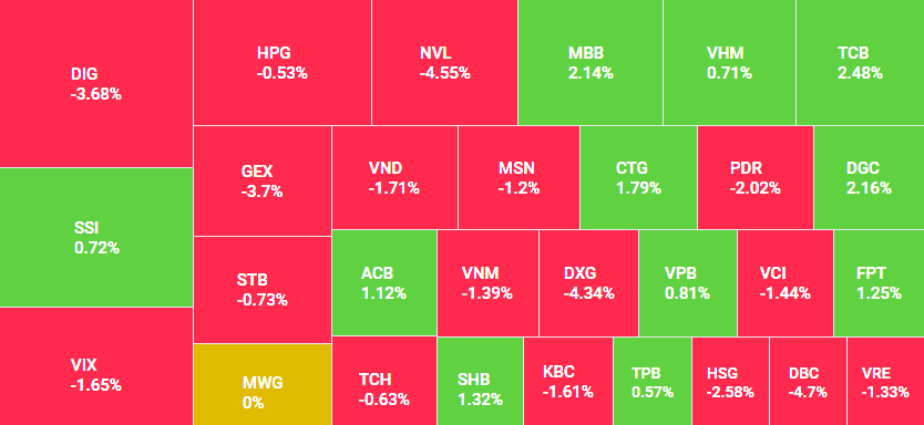 Trong khi đó, nhóm bất động sản diễn biến theo xu hướng giảm là chính, khi VIC giảm điểm ngay từ khi mở cửa đến lúc kết phiên và lấy đi gần 0,6 điểm của thị trường. Các mã khác cũng giảm sâu như NVL giảm 4,55%, DXG giảm 4,34%, DIG giảm 3,68%, ASM giảm 6,2%, CEO giảm 2,46%, PDR giảm 2,02%, HQC giảm 3,84%... Sắc xanh hiện lên ở một số ít cổ phiếu như VHM, KDH, SJS, SZC...