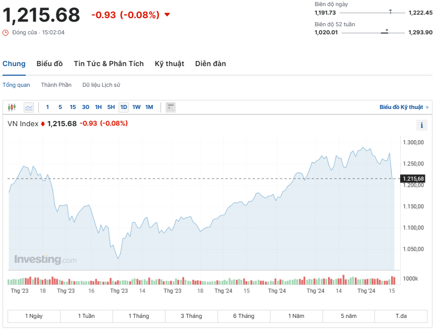 Dù có thời điểm rơi thủng mốc 1.200 điểm, nhưng VN-Index sau đó đã hồi phục mạnh, đóng cửa trở lại sát mốc tham chiếu 1.215,68 điểm, giảm 0,93 điểm, tương đương 0,08%.
