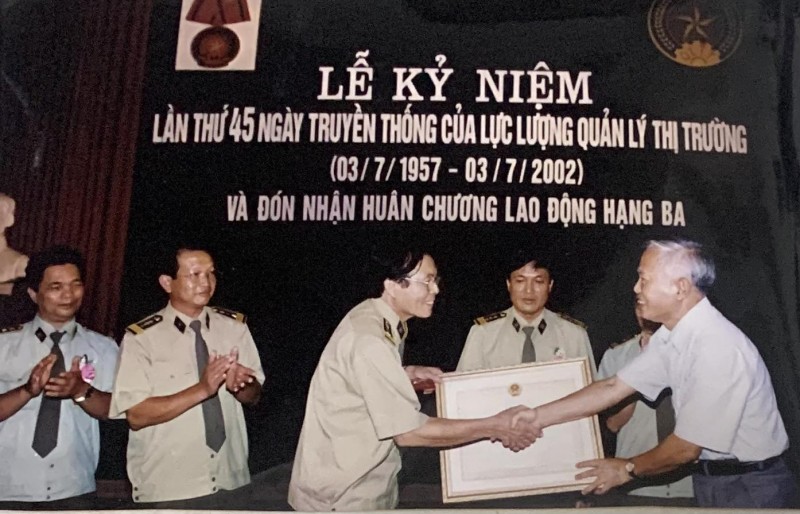 | Bộ trưởng Thương mại Vũ Khoan với lực lượng Quản lý thị trường- Ảnh: Tư liệu báo Công Thương |