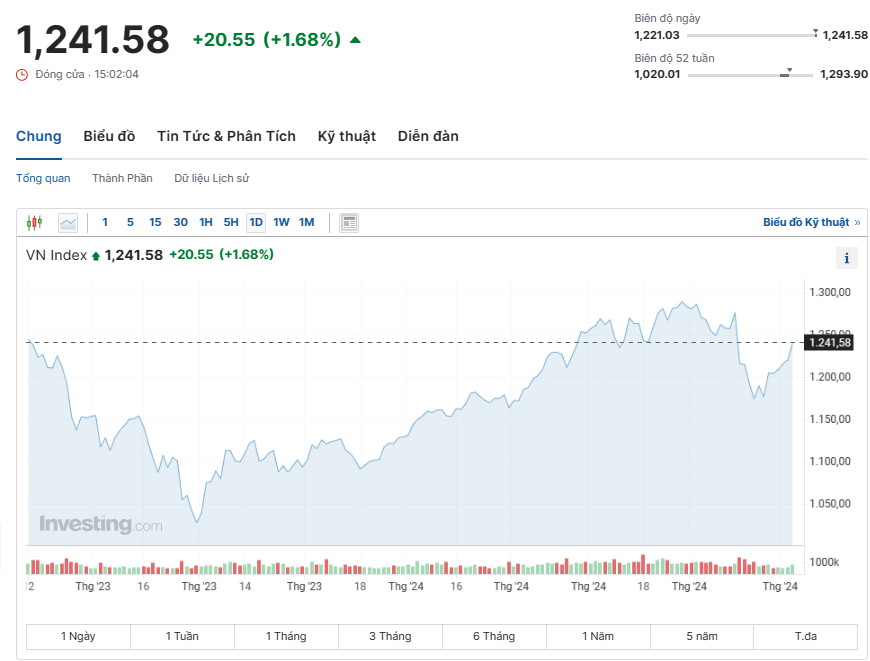 | Phiên giao dịch ngày 6/5, VN-Index tăng 20,55 điểm, tương đương 1,68% lên 1.241,58 điểm |
