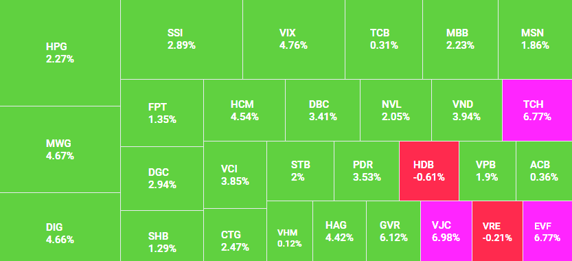 Đóng cửa giao dịch, toàn sàn HoSE có 390 mã tăng, trong đó có 16 mã trần, chỉ có 76 mã giảm. Tổng khối lượng giao dịch toàn thị trường đạt gần 1.001 triệu cổ phiếu, tương đương tổng giá trị thanh khoản 23.804,75 tỷ đồng.