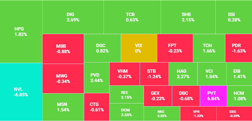 Theo đó, HPG tiếp tục là cổ phiếu hoạt động tích cực nhất thị trường khi đóng góp gần 0,8 điểm với mức tăng 1,82%. Đà tăng của HPG đã nâng vốn hóa của HPG lên 178 nghìn tỷ, vượt qua VHM và GAS lọt vào Top 3 cổ phiếu có vốn hóa lớn nhất sàn. GAS và PLX cũng là 2 cổ phiếu diễn biến tích cực, đóng góp 0,62 và 0,41 điểm vào chỉ số chung.