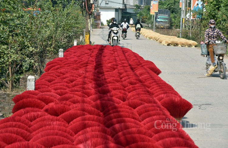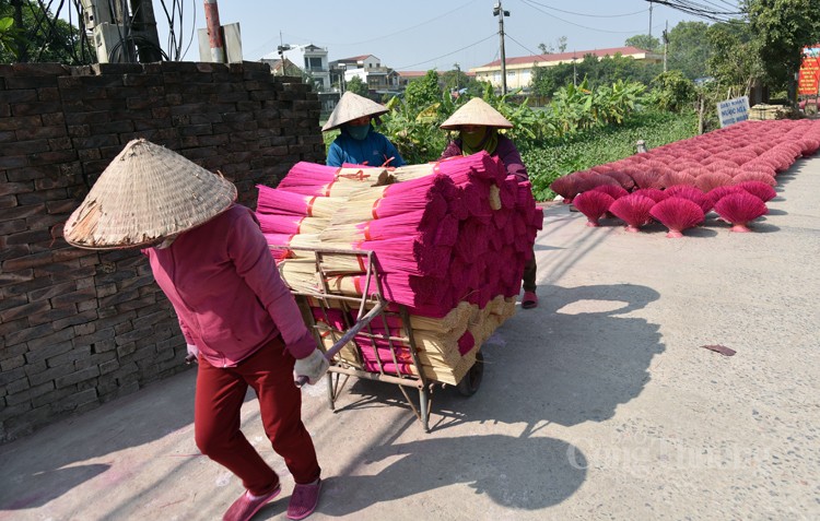 Từ đầu làng chúng ta đã cảm nhận mùi hương thơm ngào ngạt mang đậm nét trầm mặc cội nguồn của làng nghề làm hương Quảng Phú Cầu, huyện Ứng Hòa, thành phố Hà Nội. Trên đường dẫn vào các thôn, không khó để bắt gặp nhiều xe cộ, phương tiện vận chuyển lớn nhỏ ra vào để mang hương đi bán. Những đóa “hoa tăm hương” rực sắc màu đỏ, hồng, vàng… “bung nở” dọc đường làng, bãi đất trống, bờ mương, sân đình, báo hiệu một mùa Tết đang cận kề.
