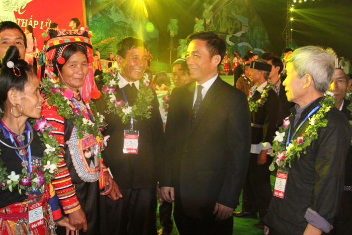 Thứ trưởng, Phó Chủ nhiệm UBDT Đinh Quế Hải trò chuyện cùng người có uy tín tại buổi lễ tuyên dương