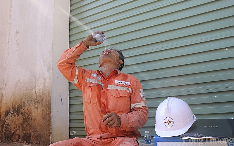 | Nền nhiệt tăng cao, không khí oi bức khiến những người thợ điện thường xuyên làm việc ngoài trời thêm phần vất vả. Người thợ điện tranh thủ uống nước, lấy lại sức để làm việc trong thời tiết khắc nghiệt. |