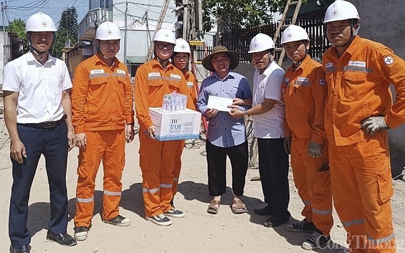 | Linh mục Nguyễn Ngọc Ngữ (đứng giữa) đại diện cho Giáo xứ Phúc Yên, huyện Thanh Chương trao quà động viên CBCNV Điện lực Thanh Chương đã nỗ lực cấp điện mùa nắng nóng |