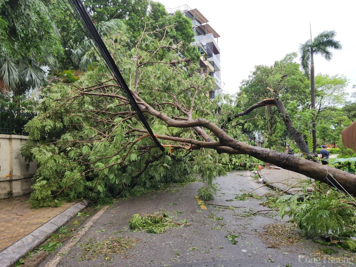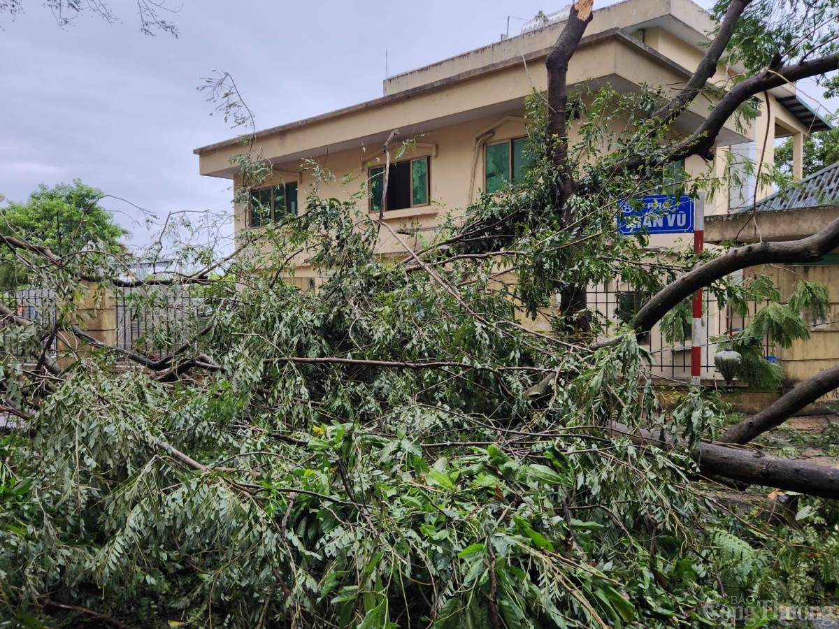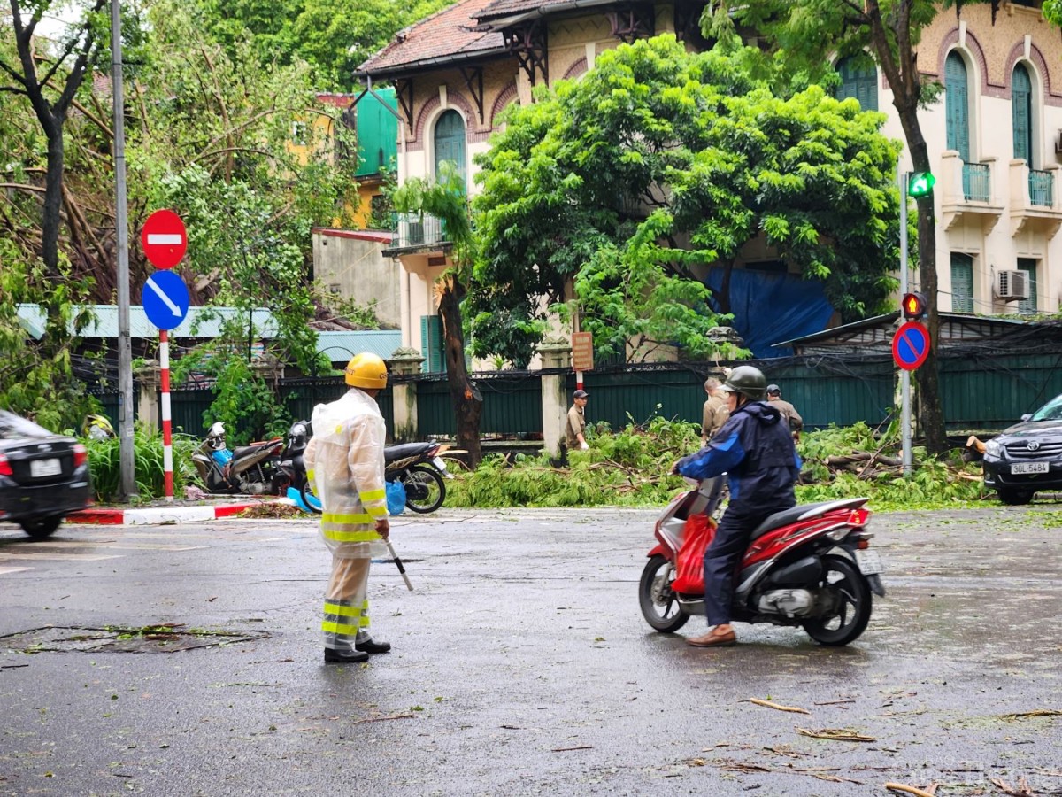 Sáng ngày 8/9, tại con phố Phan Đình Phùng, Trấn Vũ, Hoàng Diệu... được mệnh danh là những con phố đẹp nhất của Hà Nội giờ đây chỉ còn sự hoang tàn bởi những cây cổ thụ cả trăm năm buổi bật gốc, gãy đổ nằm chắn ngang đường.