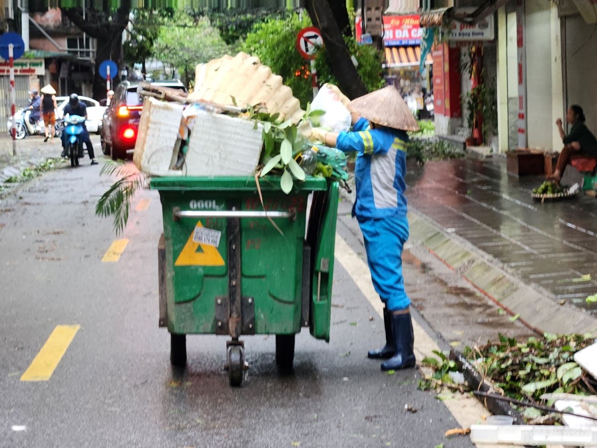 | Công nhân môi trường dọn dẹp sau bão tại phố Đặng Dung |
