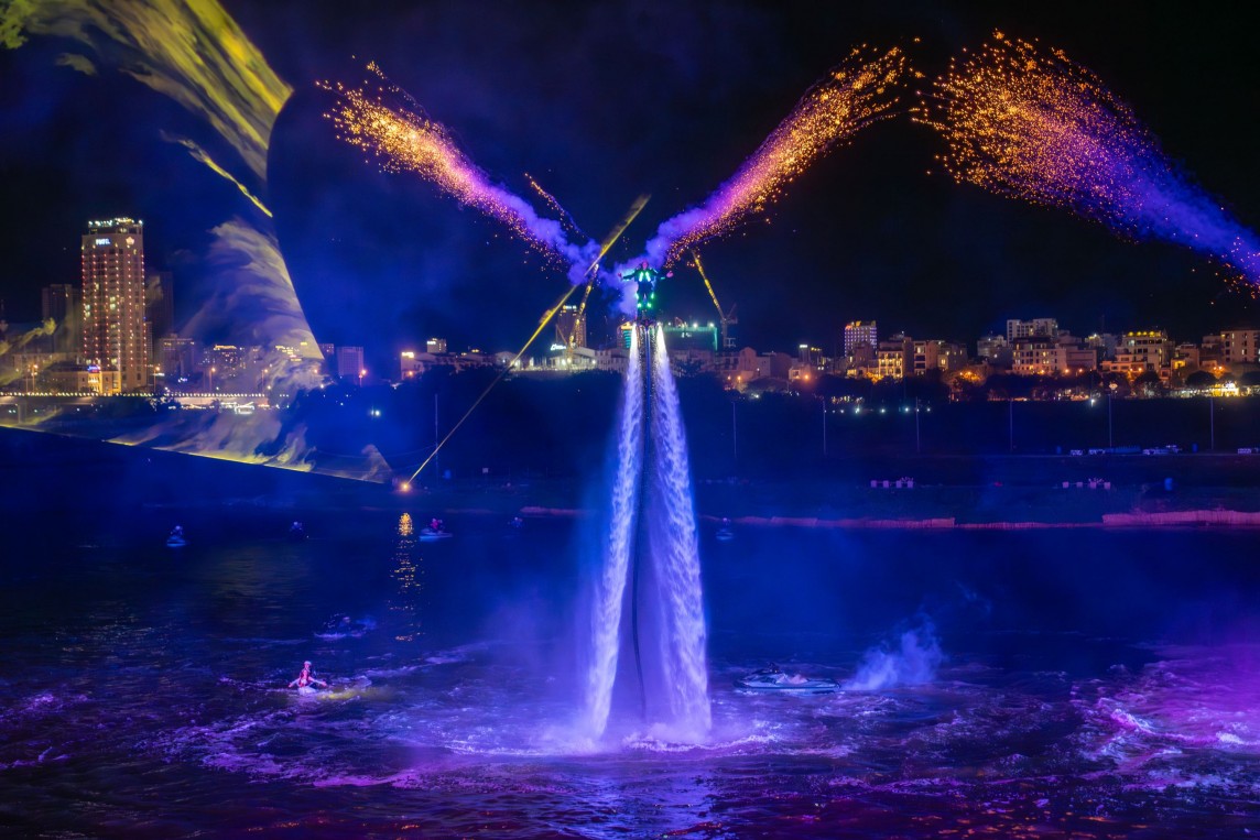 Đây cũng là phần được mong chờ nhất trong show diễn, khi từng đợt pháo hoa nối nhau vút lên từ mặt sông, kết hợp màn drift mang theo pháo sáng “xé” màn đêm của dàn jetski, hay màn bay lượn kỳ ảo như “iron man” ngoài đời thực với những đôi cánh pháo hoa trên lưng của các vận động viên flyboard.