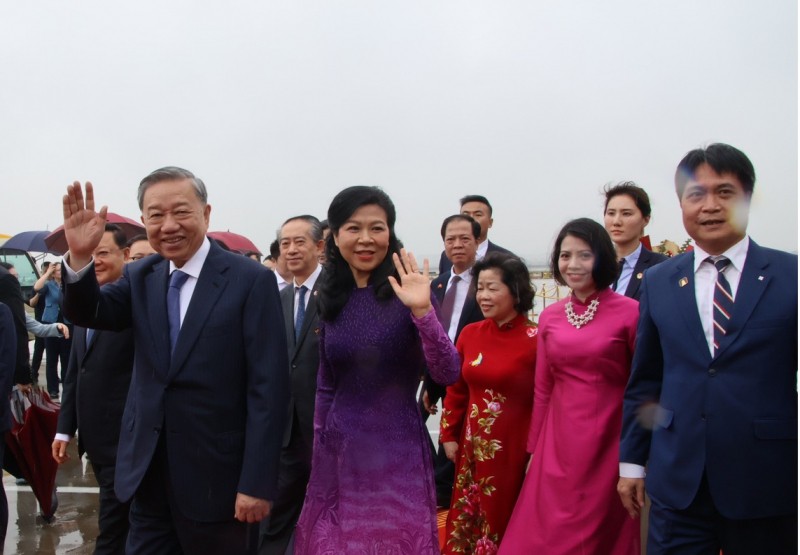 | Tổng Bí thư, Chủ tịch nước Tô Lâm cùng Phu nhân tại Sân bay quốc tế Bạch Vân. Ảnh: VOV |