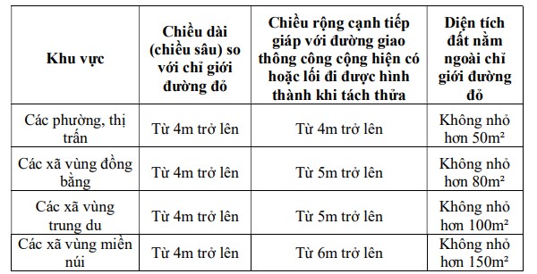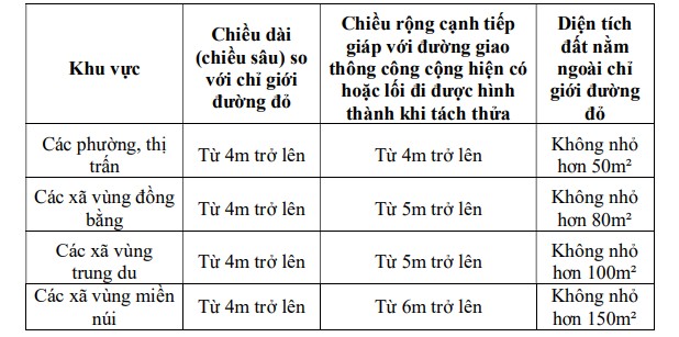 Tại các xã vùng đồng bằng, diện tích sau tách phải không nhỏ hơn 80m2, ở vùng trung du là 100m2, vùng miền núi là 150m2. Điều này nhằm bảo đảm quy hoạch hợp lý, tránh chia nhỏ thửa đất quá mức.